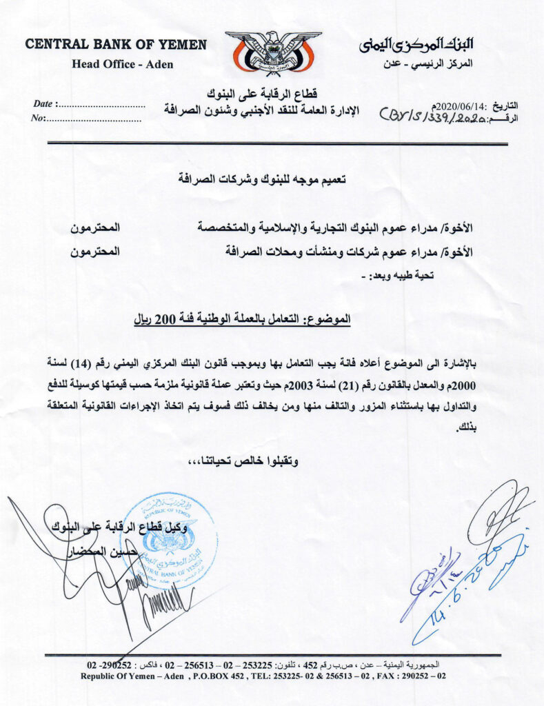 حسب تعميمه السابق، البنك المركزي اليمني يوجه بالتعامل بالعملة الوطنية فئة 200 ريال